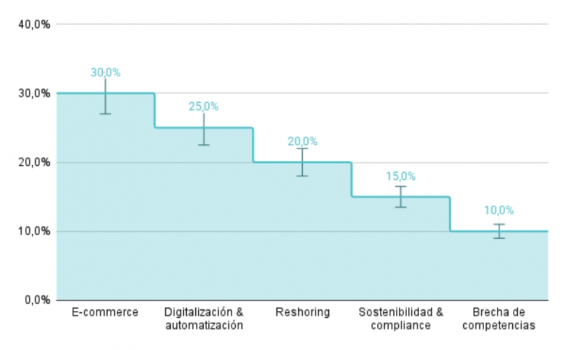 La expansión del e-commerce y la creación de hubs logísticos (30%), la digitalización y automatización de almacenes y transporte (25%), la búsqueda de mayor resiliencia y reshoring de proveedores (20%), la creciente importancia de la sostenibilidad y el cumplimiento/regulación en la cadena (15%) y la brecha de competencias digitales que limita la cobertura de vacantes especializadas (10%).