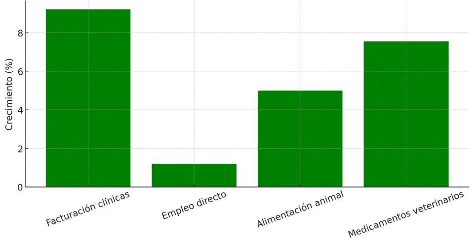 Se muestran cuatro indicadores clave: la facturación de clínicas veterinarias de pequeños animales, el crecimiento del empleo directo dentro del sector, y el rendimiento económico de las industrias de alimentación animal y medicamentos veterinarios. Cada barra representa el incremento registrado en su categoría correspondiente, expresado en porcentaje, y el color verde se ha utilizado para reforzar visualmente la idea de crecimiento y desarrollo del sector.
